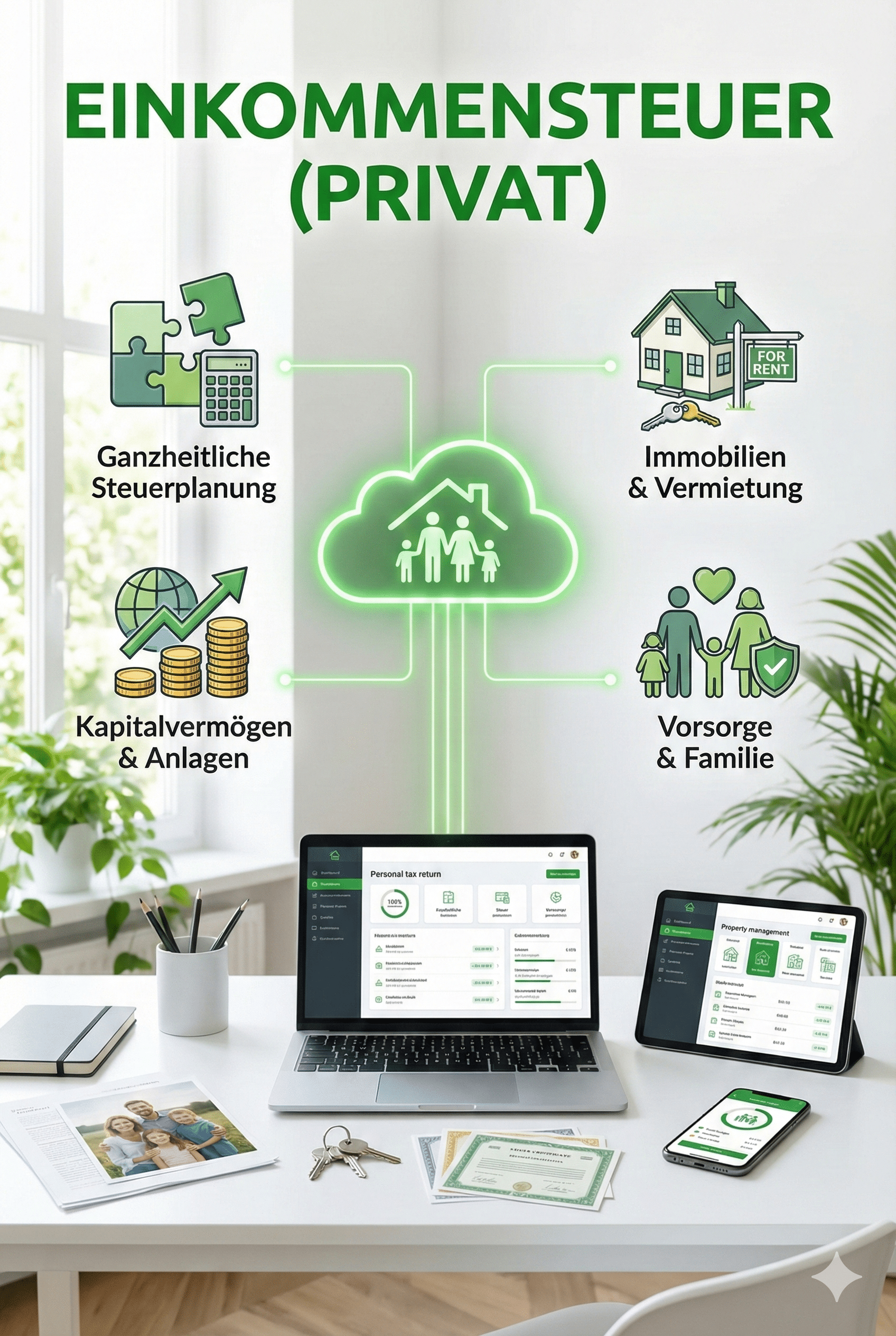 • Immobilien & Vermietung: Ob Anschaffung, Vermietung oder Veräußerung: Wir beraten dich zu Abschreibungen, Werbungskosten und der steuerlichen Behandlung von Immobilienvermögen.