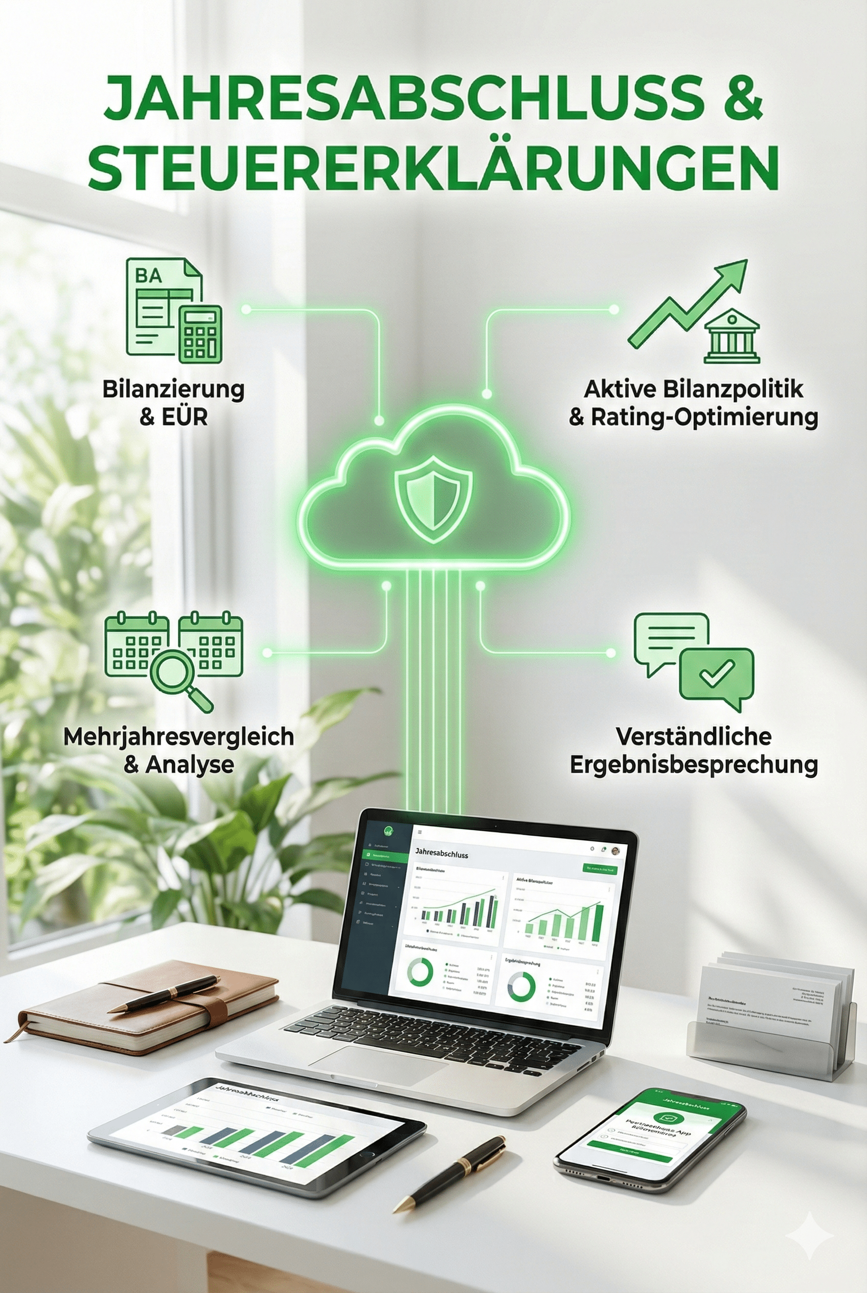 Der Jahresabschluss ist die Visitenkarte deines Unternehmens. Er dient nicht nur der Festsetzung der Steuerlast, sondern ist die wichtigste Informationsquelle für Banken, Investoren und für dich selbst. Wir erstellen deinen Abschluss nicht nur fristgerecht, sondern gestalten ihn.