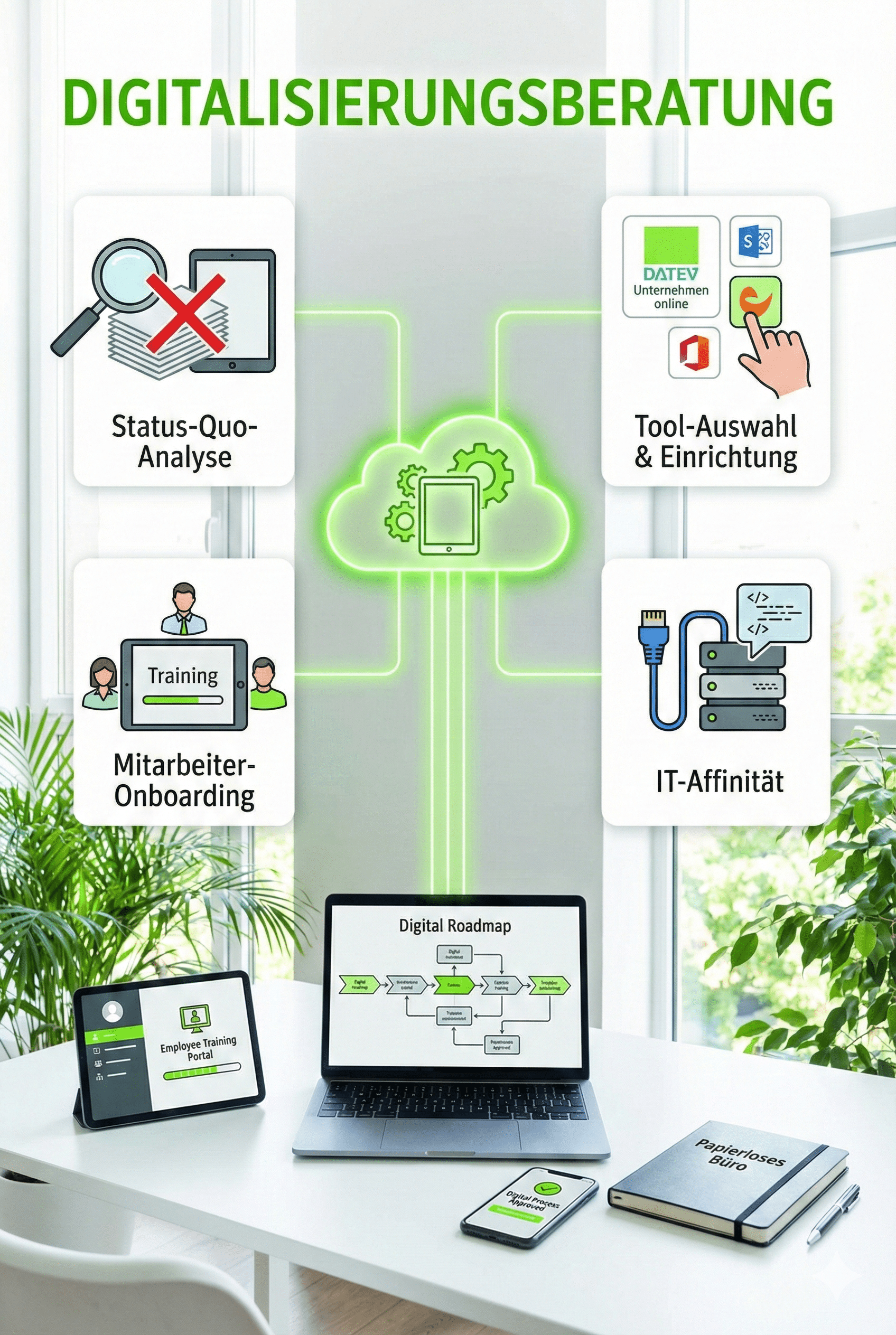 • Mitarbeiter-Onboarding: Die beste Software nützt nichts, wenn sie niemand bedient. Wir helfen dir und deinem Team, die neuen digitalen Prozesse zu verstehen und sicher anzuwenden.
