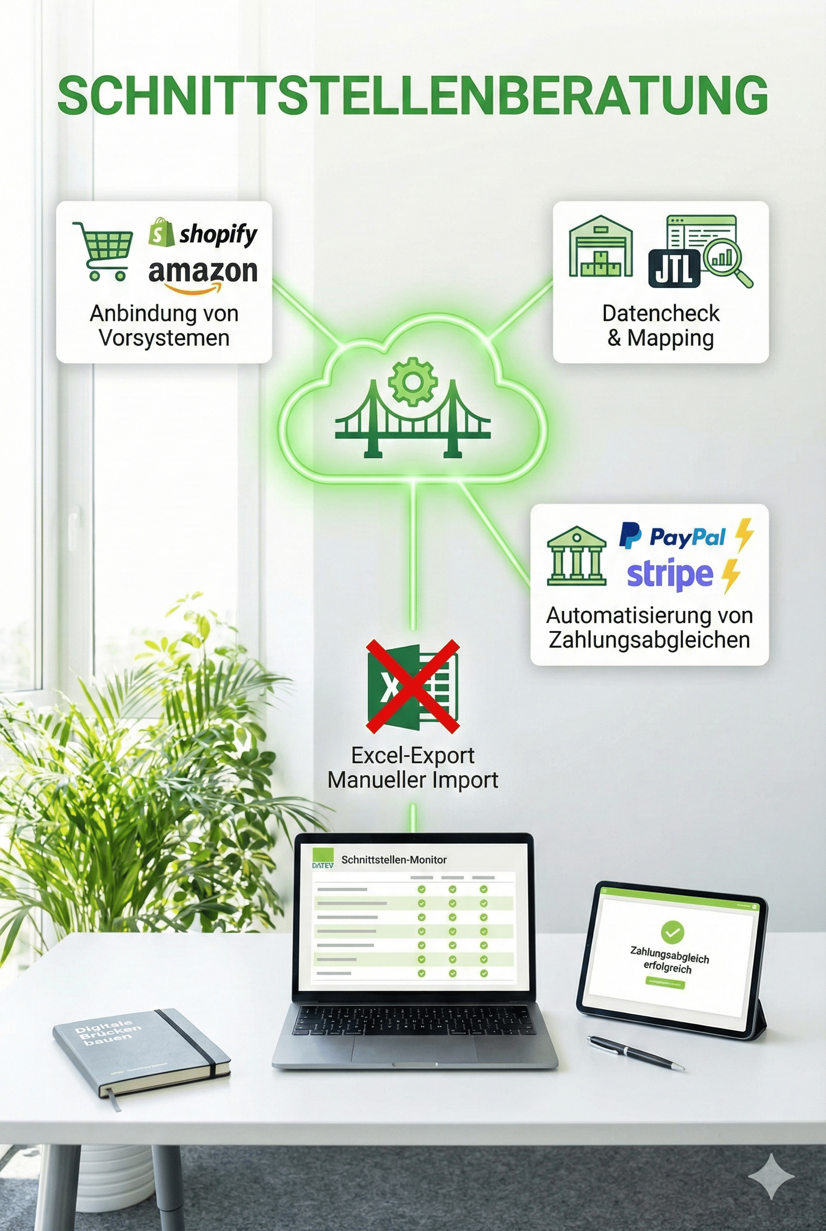• Anbindung von Vorsystemen: Egal ob Shopify, Amazon, JTL, Lexware oder spezielle Branchensoftware: Wir prüfen, wie wir deine Systeme am besten an DATEV anbinden.